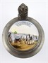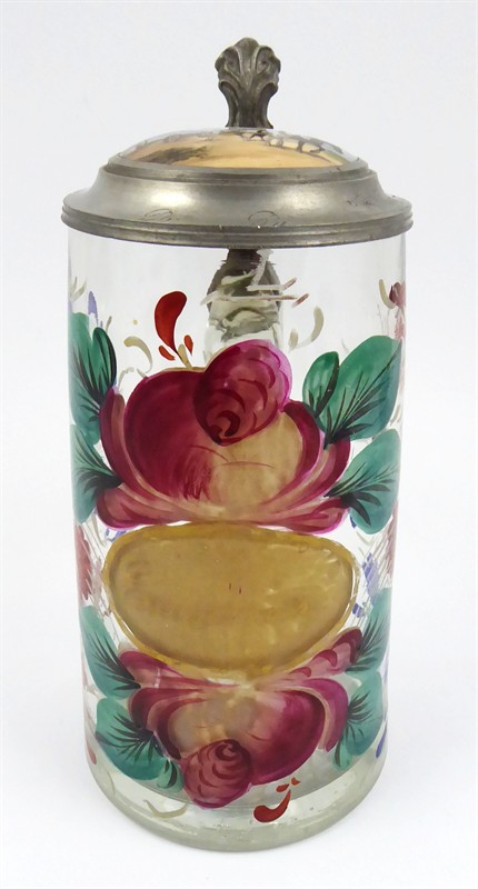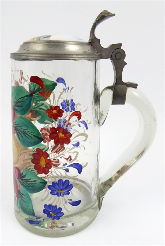 Čiré sklo, ruční malba, porcelán, cín a zlacení. Období a styl: pozdní biedermeier. Skleněný korbel s centrálním zlaceným medailonem s nápisem Erinnerung (Vzpomínka) vsazeným do ruční malby v podobě stylizovaných květů růže s listy a drobnými kvítky. Cínové okruží a víko s rytými počátečními písmeny jména a příjmení majitele korbelu na horním obvodu víka. To je zdobeno porcelánem s ruční malbou sedláka a koní při orbě pole. Doplněno o nápis v němčině popisující každodenní život hospodáře. Střední Evropa 1850 - 1880. Výška 23 cm.
