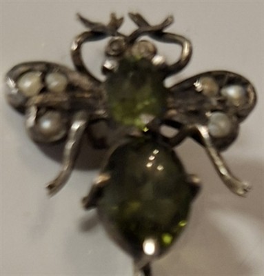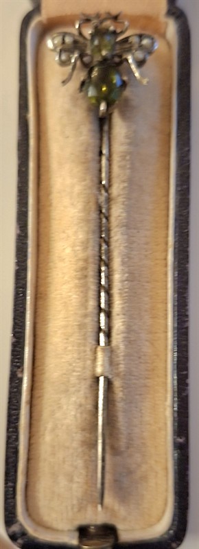 Moucha - rozměr 19 mm x 11 mm, 2 olivíny, 6 kusů sladkovodních perliček, na nožičce mistrovská značka RL, celková délka jehlice 7,5 cm, hmotnost 2,12 g, stříbro 835/1000 (nově puncováno na jehle viz. Boleta PÚ), Rudolf E. Langer (1847-1915) zakladatel a majitel významného zlatnického, stříbrnického a bižuterního závodu historismu a secese v Lanškrouně („Gold Silberwaaren Fabrik R. E. Langer“ zal. 1877). Velmi brzo začal své velmi kvalitní výrobky exportoval do zahraničí. Na přelomu let 1888-1889 otevřel firemní obchod ve Vídni. Úspěšný byl i na světové výstavě v Chicagu (1893). Langer brzy získal titul dvorního dodavatele a těšil se přízni členů habsburského domu včetně samotného císaře Františka Josefa I. Císař dokonce navštívil v roce 1894 Langerovu továrnu v Lanškrouně (jako dar obdržel psací soupravu ze stříbra, osázenou perlami, safíry a rubíny). Po smrti RL a dědických sporech došlo k úpadku firmy, kterou se po roce 1918 nepodařilo obnovit.