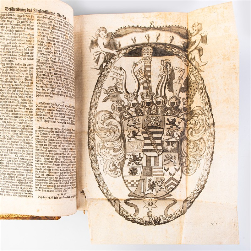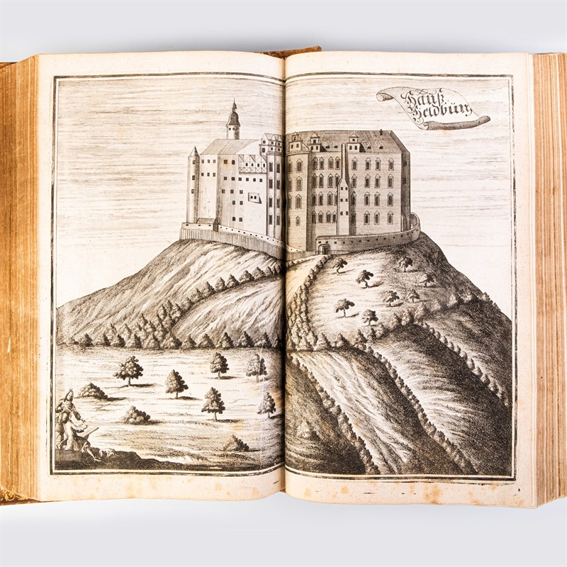 Původní kožená obálka 35:22 cm, zlacená ořízka. 5 dílů a přívazek jednom svazku. Frankfurt nad Mohanem a Lipsko: Christian Benschen, (1711-17). Textový blok kompletní. Nejméně 50 mědirytinových příloh. Portréty, pohledy na hrady, paláce, erby, numismatika, genealogické tabulky atd. Nekolik příloh ve srovnání s dalšími exempláři chybí. Přívazek: Gleichenstein, Hans Basilius von: Tabulae genealogicae, oder Derer von Adel Des Fürstenthums Sachsen-Gotha, stemmatographia alphabetica. Frankfurt nad Mohanem a Lipsko: Gensch [1716].