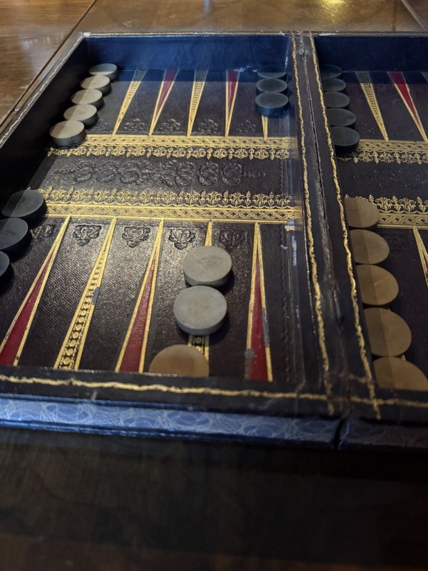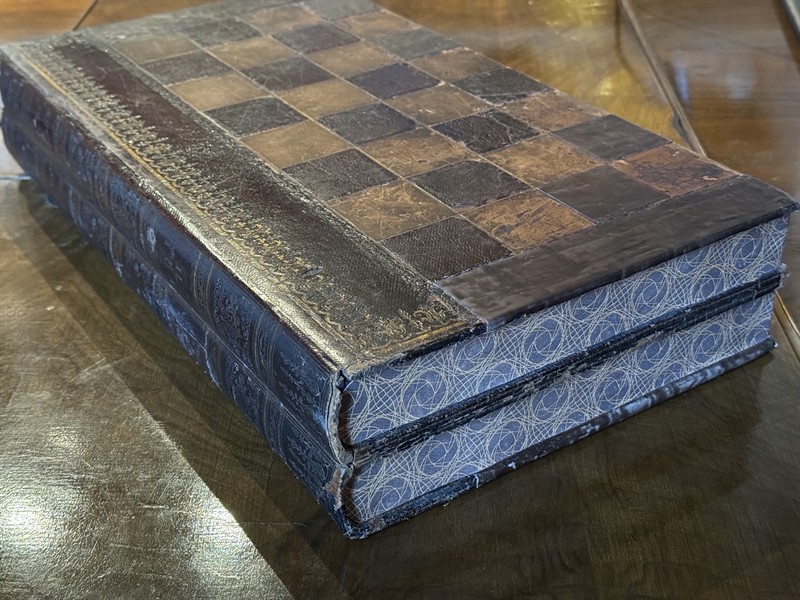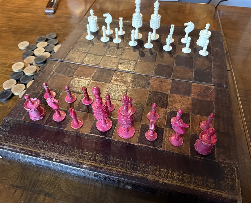 Maskované jako kniha v knihovně. Figurky červeně barvená kost a přírodní kost. Šachovnice z kůže, vše s patinou stáří! Ale to je právě to kouzelné! Opravdu jedinečný nevídaný kus. Backgammon- vrchcáby, kameny ze dřeva v průměru 2,5 cm. Výška šachových figurek do 11 cm.