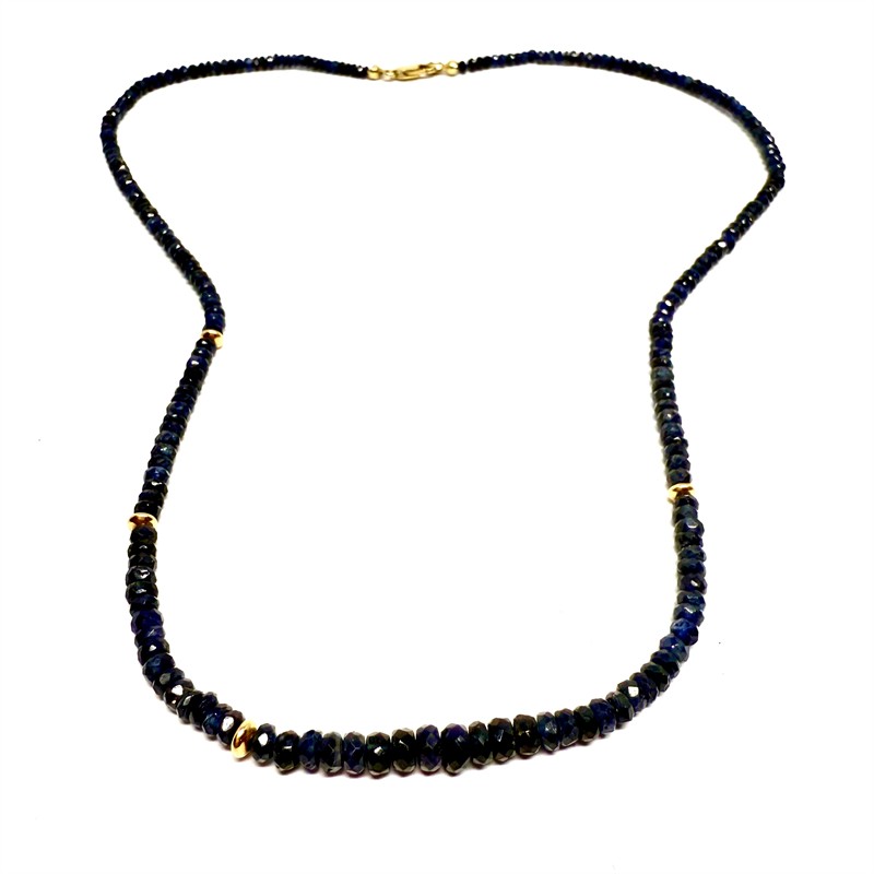 Elegantní safírový náhrdelník zdobený zlatými komponenty. Šperk byl zhotoven z mnoha desítek modrých safíru o průměru 2 - 4 mm. Zapínání a asymetricky rozmístěné zlaté zdobení vyrobeno ze zlata ryzosti 585/1000. Váha 10,67 g. Délka šperku 46 cm .Výborný stav.