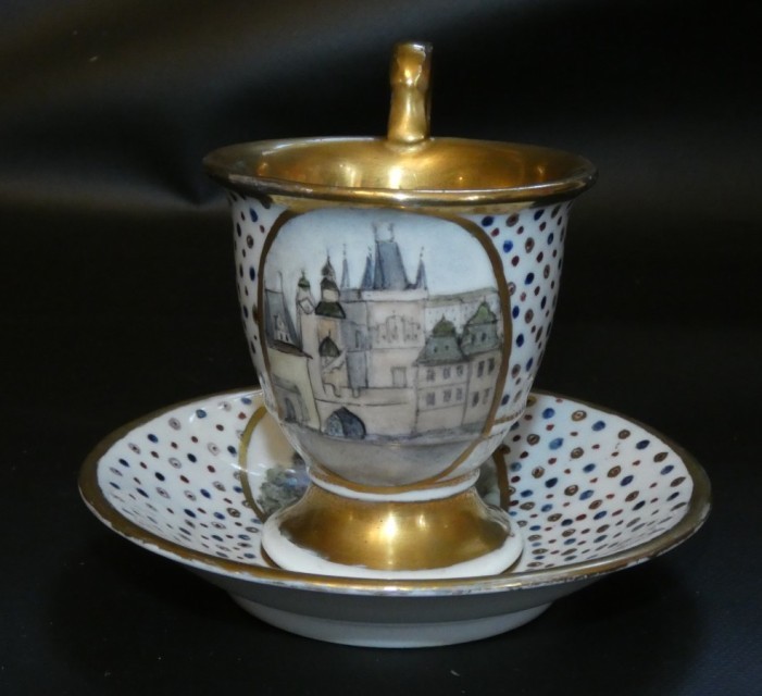 Šálek s podšálkem s vedutou Slavkov 19.století.