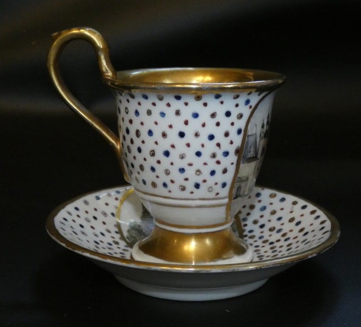 Šalek s podšálkem s vedutou.Zdobeno ruční malbou.Značeno vtlačenou značkou S a čísly Porcelánka Slavkov 19.století.Zlatě TK.Glazovaný porcelán.Celkový rozměr 11cm x 13cm.