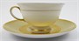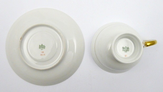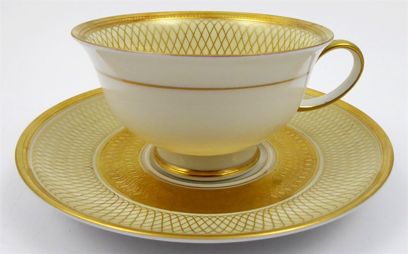 Slonovinový, bílý a zlacený porcelán. Porcelánka Rosenthal. Název vzoru: Aida. Porcelánový šálek s podšálkem slonovinové barevnosti dekorovaný motivem zlacené mřížky a silně zlacenými ornamentálními pásy. Značeno zespodu: Rosenthal, Selb-Plössberg, Bavaria-Germany, Aida a značka malíře. Německo, Selb-Plössberg, 50. léta minulého století. Výška šálku 6 cm, průměr podšálku 15,5 cm.