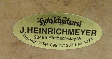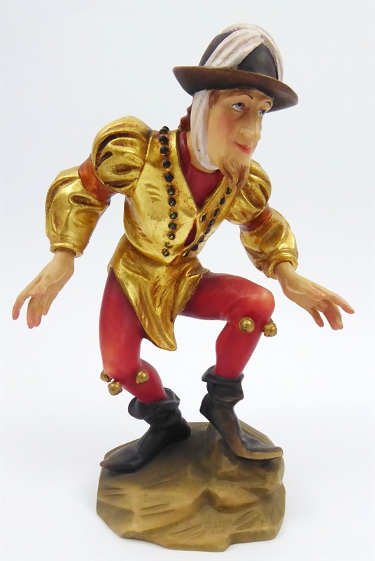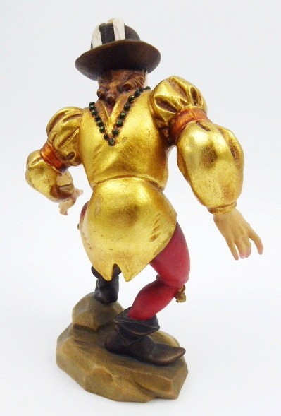 Dřevořezba, polychromie, zlacení. Práce profesionálního řezbáře. Kopie ze světově proslulé série Moriskentänzer (tanečníků Morrisova tance). Autor originální předlohy: Erasmus Grasser (1450-1518) slavný německý pozdně gotický řezbář, sochař a architekt. Historický charakter tance má svůj původ v bojích křesťanů se Saracény (Maury). Název této figury: Schneiderlein (Krejčí - Tančící krejčí). Výrobce: Řezbářství J. Heinrichmeyer, Rimbach, Německo. Ručně barevně malovaná a zlacená dřevořezba tančícího krejčíře v dobovém oděvu s kloboukem a červenými punčochami zdobenými zlatými rolničkami a se špičatými botami. Na stylizovaném reliéfním podstavci. Značeno zespodu na podstavci: originální zlatá nálepka výrobce. Německo, Rimbach, minulé století. Německo, Rimbach, minulé století. Výška 24 cm.