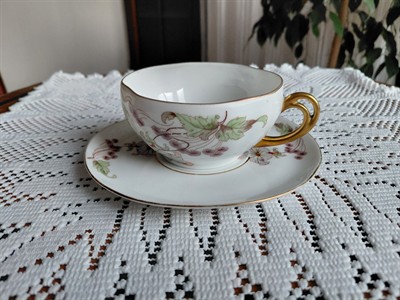 Ostrovská porcelánka Pfeiffer & Löwenstein Schlackenwerth . Šálka s podšálkou s mimoriadne tenkým črepom. Podľa odborného posúdenia tento ojedinelý tvar navrhol pravdepodobne Arch. Josef Hoffmann v rokoch 1901-1903 a dekor bol realizovaný vo viedenskom ateliéry Josefa Böcka. Šálka priemer 10 cm, výška 5 cm Podšálka priemer 15 cm