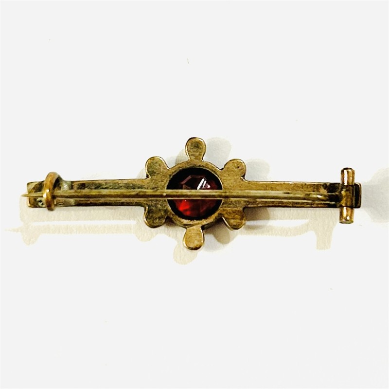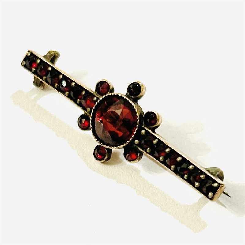 Půvabná brož z období secese, tělo tvořeno linií s centrální nevšední hlavicí připomínajíc květ či Slunce, osazeno větším přírodním almandinem kulatého brusu a českými granáty kulatého routového brusu. Fasováno nýtkovou technikou a obrubami, kvalitní tuzemská granátnická práce z počátku 20. století. Zasazeno ve slitině tombaku; neznačeno. Hmotnost 2,21 g, délka 36 mm, šířka 12,5 mm. Zapínání na "C" sponu v pořádku (v minulosti opravováno), celkově v zachovalém stavu.