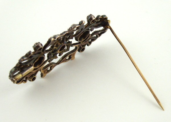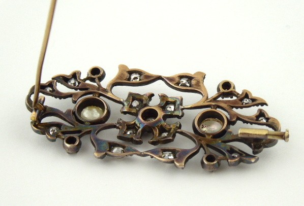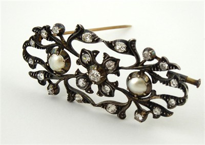 Zlato různé větší ryzosti, stříbro, přírodní diamanty, perleť. Hezká klenotnická práce. Ryzost zlata 735/1000, 715/1000 a 700/1000. Stříbro o ryzosti 900/1000. Zlatá jehla o ryzosti 735/1000, zlatá část brože a uchycení jehly o ryzosti 715/1000, zlaté zavírání jehly o ryzosti 700/1000. Stříbrná přední část brože o ryzosti 900/1000. Celková hmotnost 9,50 g. 31 přírodních diamantů starého briliantového brusu a výbrusu 16/16 o váze 1,40 ct, barva H-I, čistota Si-P. Přiloženo osvědčení Puncovního úřadu České republiky. Tvarově zajímavá brož je osázená 31 přírodními diamanty o celkové hmotnosti 1,40 ct. Evropa kolem roku 1900. Šířka 55 mm, výška 25 mm.