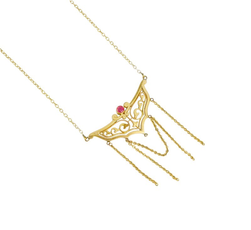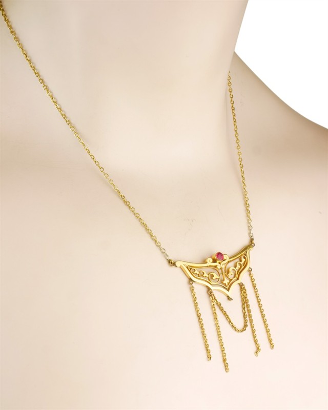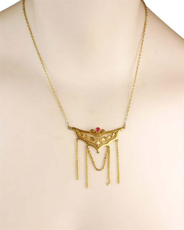 Náhrdelník ze silně zlaceného tombaku zdobený červeným kamenem. Délka náhrdelníku je 64 cm. Rozměry ověsu činí 4,0 x 2,0 cm (visící řetízky jsou dlouhé 3,2 cm). Celková hmotnost 5,92 g.