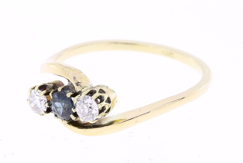 Jemný prsten v secesním stylu, vyrobený ze zlata ryzosti 565/1000, s kameny zasazenými do zlata ryzosti 585/1000. Dominantou prstenu je centrální safír o hmotnosti přibližně 0,10 ct, po jehož stranách jsou zasazeny dva brilianty o celkové hmotnosti přibližně 0,18 ct. Detaily: Materiál: zlato 565/1000 a 585/1000 Kameny: 2 brilianty (celkem cca 0,18 ct) Centrální kámen: safír cca 0,10 ct Celková hmotnost: 2,04 g Velikost prstenu: 53 Styl: secese Osvědčení: vydáno Puncovním úřadem