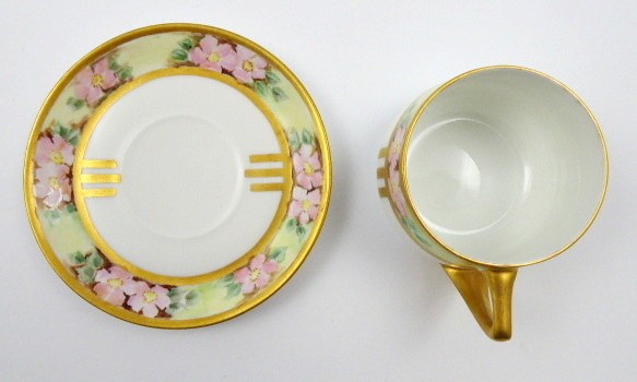 Bílý, barevně ručně malovaný a zlacený porcelán. Období a styl: secese. Porcelánka Rosenthal. Název vzoru: Donatello. Elegantní porcelánový šálek s podšálkem z období secese s ručně na glazuře malovanými květy šípkových růžiček s listy a úponky. Barevné pásy jsou ohraničené silným zlacením. Celozlacený hraněný úchyt. Značeno zespodu: značka Rosenthal platná pro dané období a název vzoru Donatello. Německo, Rosenthal, kolem roku 1910. Výška šálku 5,5 cm, průměr podšálku 12,5 cm.