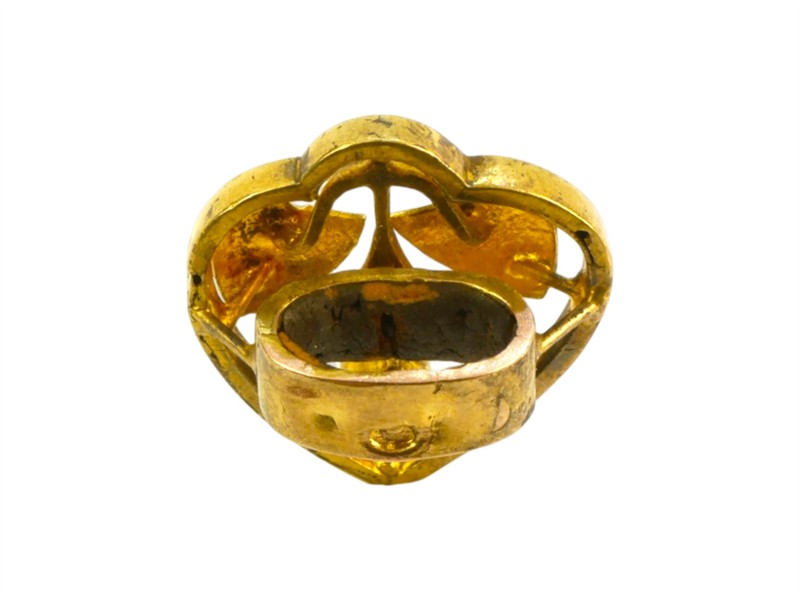 Drobný secesní šperk ve tvaru srdíčka zdobeného safírem a dvěma říčními perličkami byl zhotoven ze žlutého zlata ryzosti 530/1000. Zřejmě je to jezdec k šatlénu nebo posuvný jezdec (slider) k dlouhému náhrdelníku. V secesi byly tyto „posuvky“ ve tvaru srdíček s rostlinnými motivy nesmírně populární. Často tvořily komplet s koncovým medailonkem nebo hodinkami. Po drobné úpravě bude možné použít srdíčko jako přívěšek. Rozměry 18 x 16 cm, celková hmotnost 1,66 g.