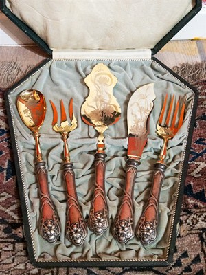 Starožitné, velmi dekorativní stříbrné předkládací příbory v kazetě, Rakousko - Uhersko, období secese, kolem roku 1905 puncovní značení S-35 - AV, stříbro o ryzosti 815/1000 o celkové hmotnosti 457,23 g