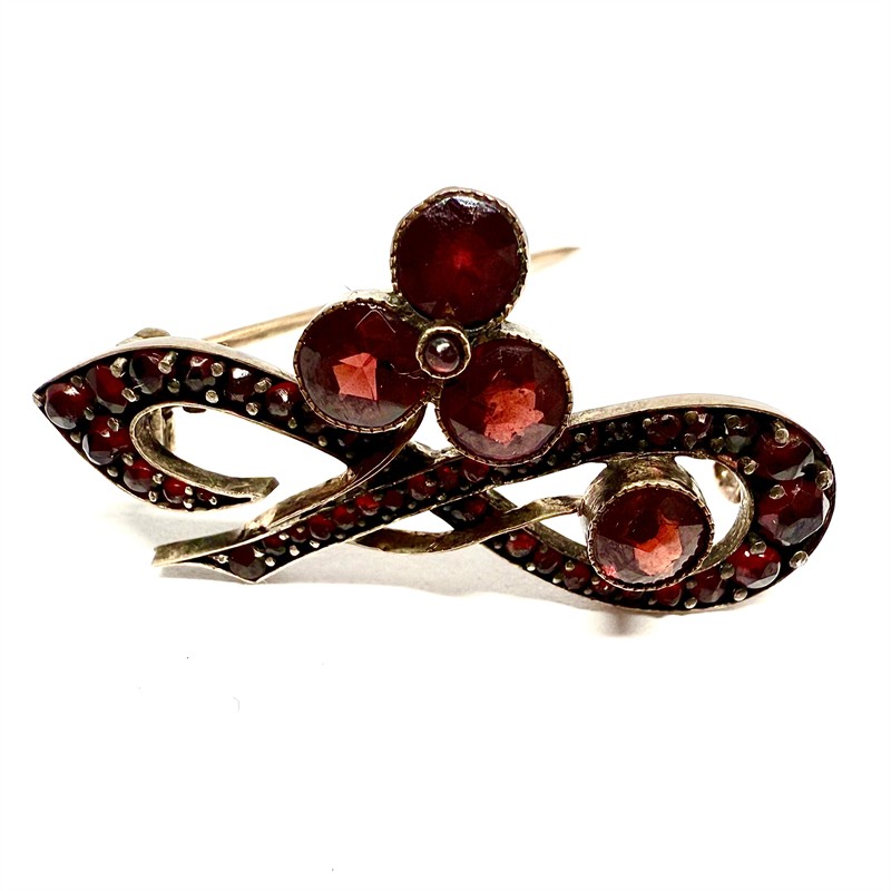 Jemná secesní brož s českými granáty a almandiny. Šperk byl zhotoven z tombaku počátkem 20.století a nese půvabný florální motiv. Rozměry 3 x 2 cm. Výborný stav.