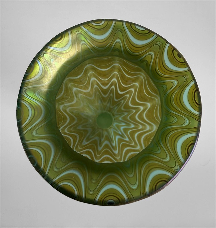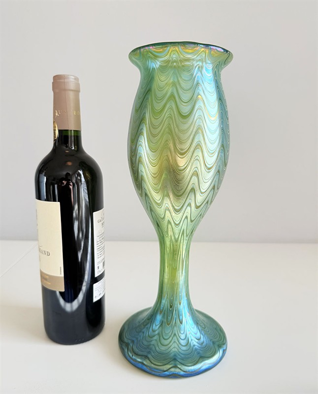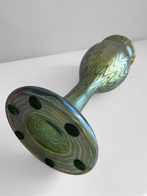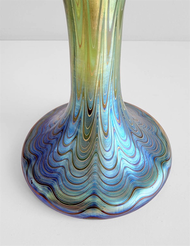 secesní váza šumavské sklárny Loetz z Klášterského Mlýna, dekor PG 6893, Čechy, kolem roku 1899, výška 31,8 cm, průměr 13 cm