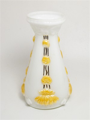 Váza z počátku minulého století z opálového (mléčného) skla foukaného hutně do formy s hlubokým reliéfem, který je zušlechtěný zlacením a perleťovým listrem. Půvabná sklářská práce z období Belle Époque, pravděpodobně z krystalerií na severu Čech . Dobrý stav, rozměr - v. 27 x 17 x 12cm