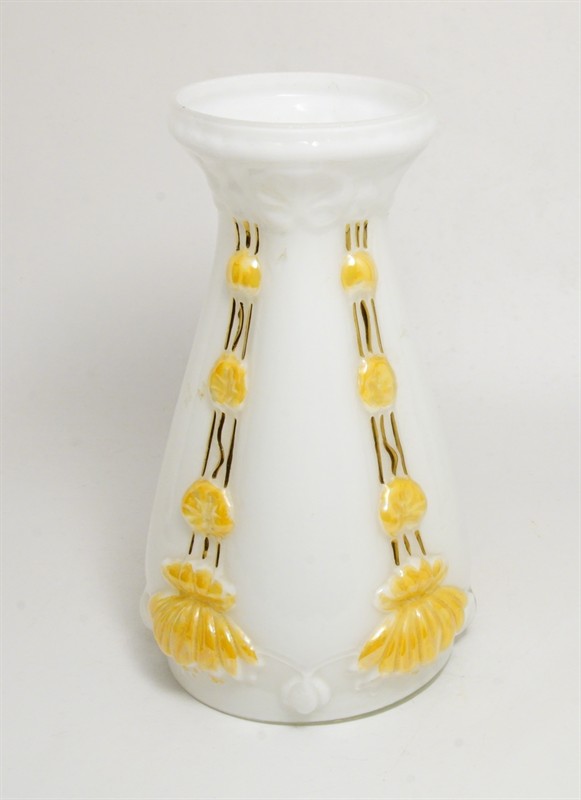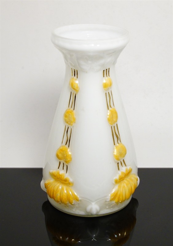 Secesní váza z malovaného mléčného skla s dekorem květů