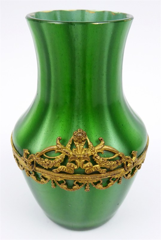 Zelené a bezbarvé sklo, žlutý kov. Období a styl: secese. Světově proslulá sklárna Johann Loetz Witwe, Klášterský Mlýn (Klösterle), založená roku 1836. Luxusní secesní vázička kónického tvaru s reliéfním žebrováním a dekorativní galvanoplastickou montáží. Vázička ze zeleného skla s metalickým stříbrným prachem přejímaná křišťálově bezbarveným sklem. Vázička dekorovaná galvanoplastickou montáží s festony ze žlutého kovu. Čechy, kolem roku 1905. Výška 12 cm.