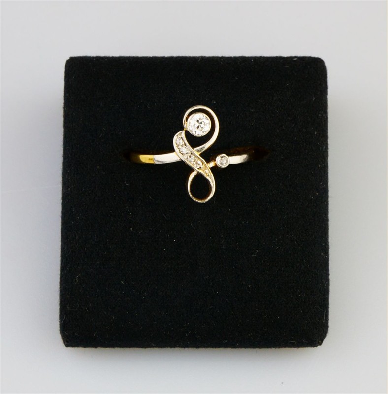pozdně secesní drobnější zlatý prsten se 6 diamanty briliantového brusu o celkové hmotnosti cca 0,15 ct, kameny vsazené v platině, Au + Pt 2,05 g/585 + 900/1000, západní Evropa, kolem r. 1920; atest Puncovního úřadu; velikost prstenu 56