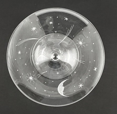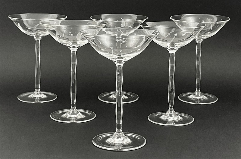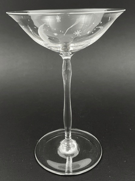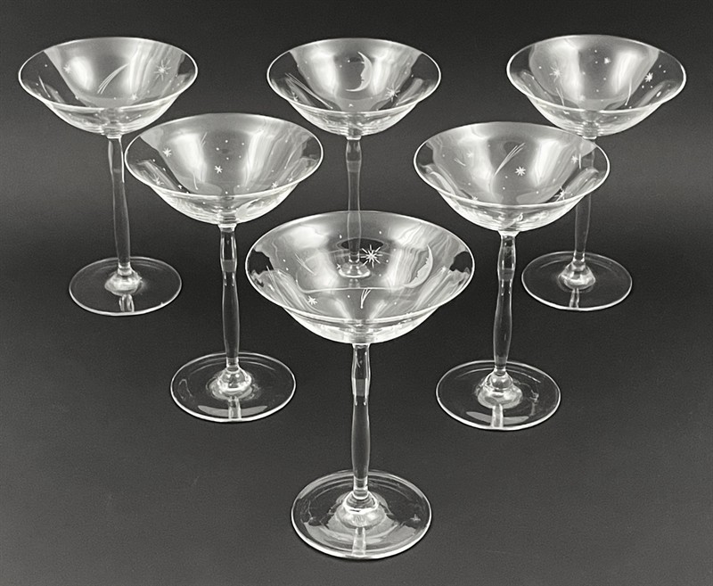 Bezbarvé ručně broušené tenkostěnné sklo. Období a styl: art deco a prvky vídeňské secese. Haida (Nový Bor) nebo Steinschönau (Kamenický Šenov) nebo Alois Metelák (1897-1980) spolu se studenty tehdejší Státní odborné sklářské školy v Železném Brodě. Ovlivněno tvorbou slavného vídeňského architekta a designéra Josefa Hoffmanna (1870-1956). Zvláště jeho návrhy mušelínového nápojového skla pro firmy J. & L. Lobmeyr, které byly často vyráběny v Čechách. Sada šesti sklenic na šampaňské a sekt s širokou otevřenou kupou. Zdobená ručně broušeným měsícem, Polárkou, dalšími hvězdičkami a kometami. Stylová profilovaná nožka zakončená kulatou patkou. Ve výborném stavu. Čechy 1925 - 1935. Výška 17 cm.