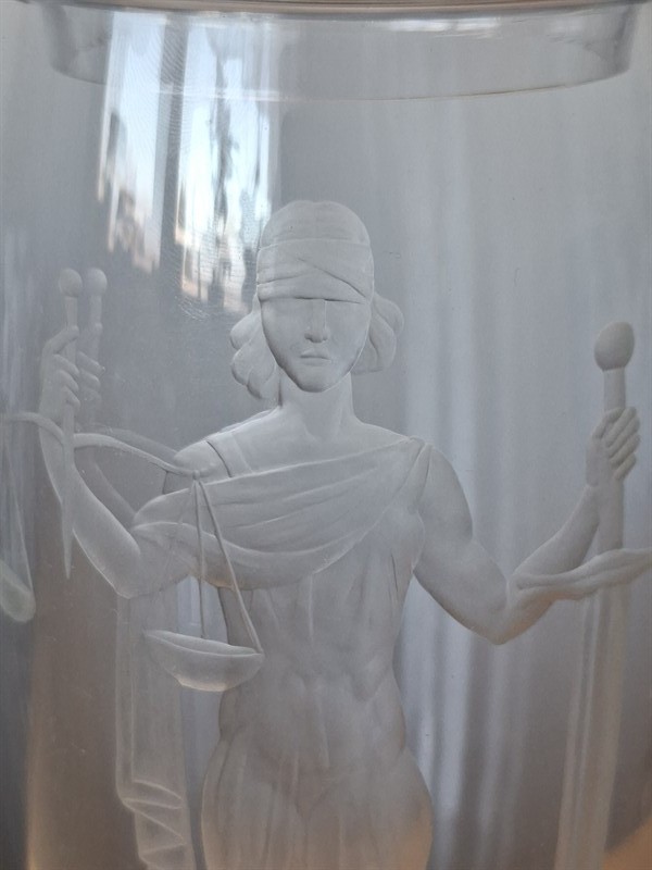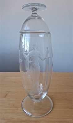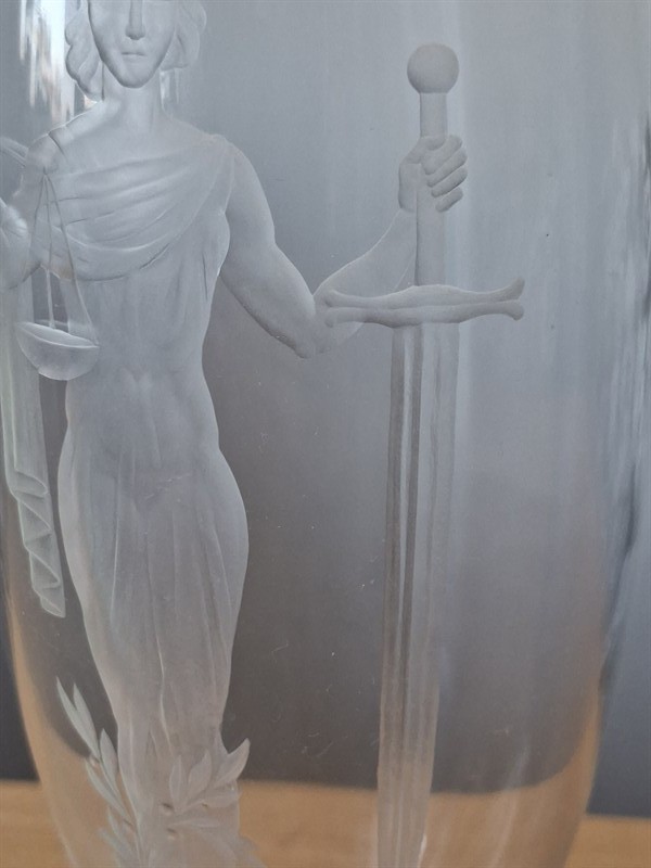 Šimek Jan - skleněný váza s víkem - brus socha spravedlnost, výška 32,5 cm, nepoškozeno, neznačeno.