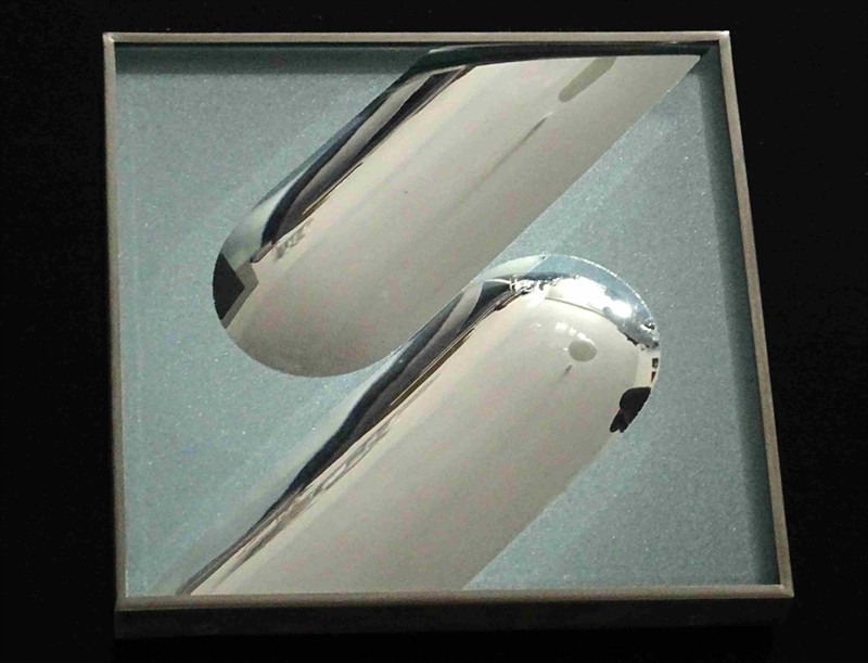 skleněná závěsná plastika ze zrcadlového skla, broušené ze zadní strany matované pískováním, adjustované do nerez rámečku s háčkem pro zavěšení, délka strany je 21 cm