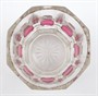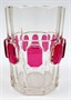 Čiré a rosalinové ručně broušené sklo. Sklenice z čirého skla zdobená ručně broušenými svislými fazetami a na středním vodorovném prstencovém pásu reliéfními vystupujícími medailony s růžovou lazurou. Čechy 1860 - 1880. Výška 11 cm.