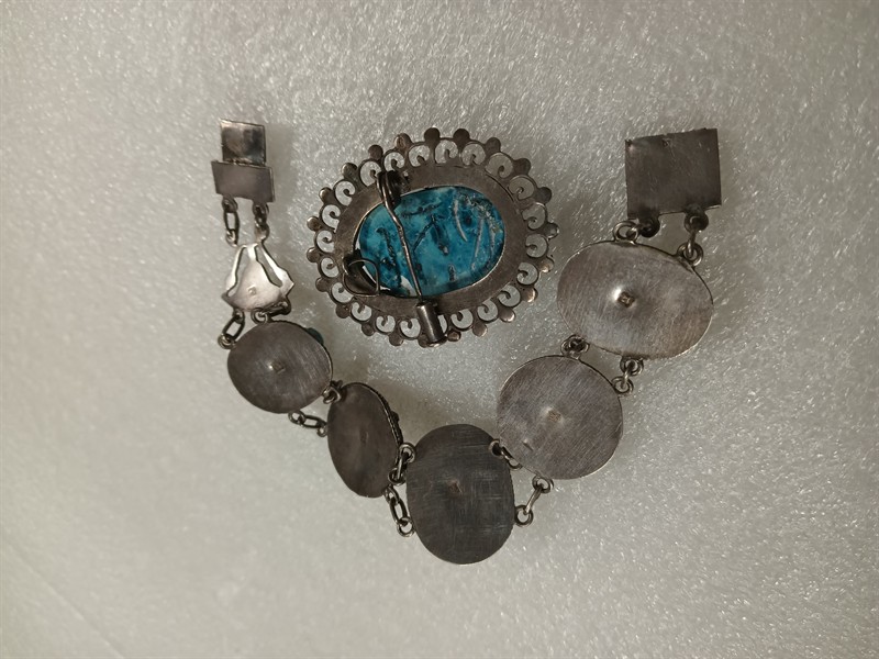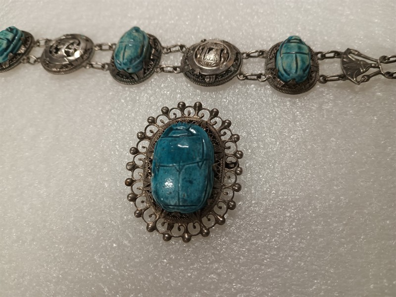 Souprava vyrobena ze stříbra ryzosti 800/1000 ( platné puncovní značky) - s motivem scarabeů . Náramek má délku 19 cm , šířku 2,3 cm . Náhrdelník, který je díky sponě možný nosit jako brož má rozměry 4,2 x 3,5 cm .Celková hmotnost 47,58 gr