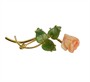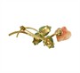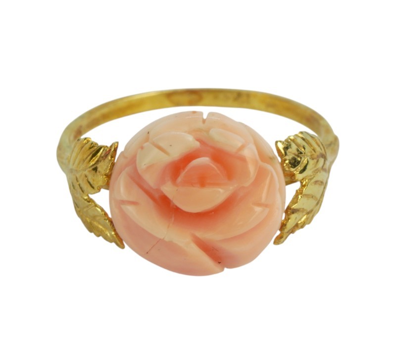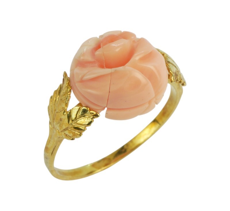 Prsten a náušnice ze žlutého zlata ryzosti 585/1000 a brož ze zlaceného obecného kovu. Šperky zdobí světlerůžový přírodní korál řezaný do tvaru růžičky. Velikost prstenu 60, hmotnost 2,75 g. Náušnice 1,92 g. Délka brože 4,6 cm.