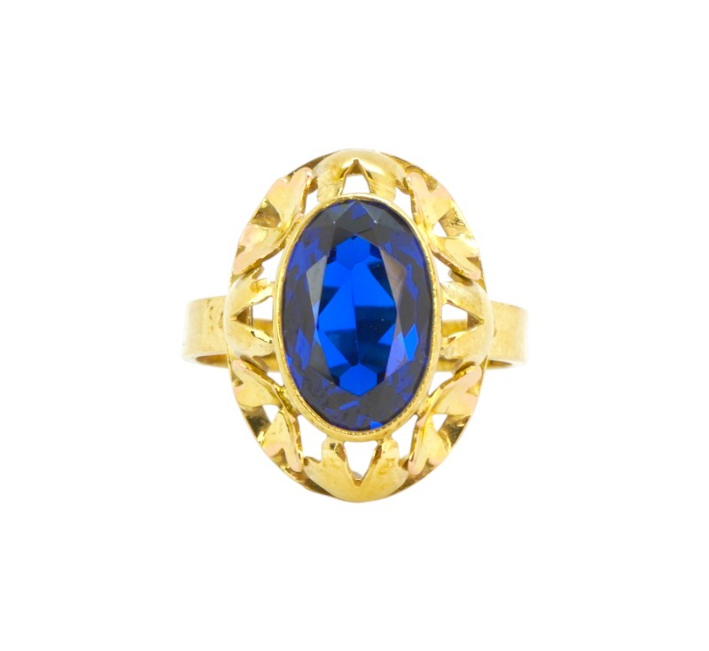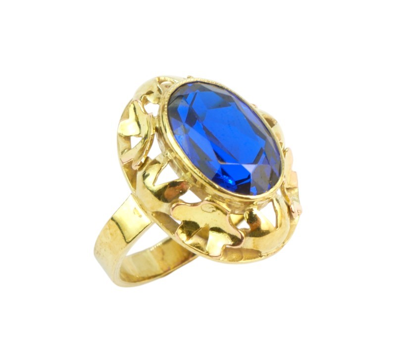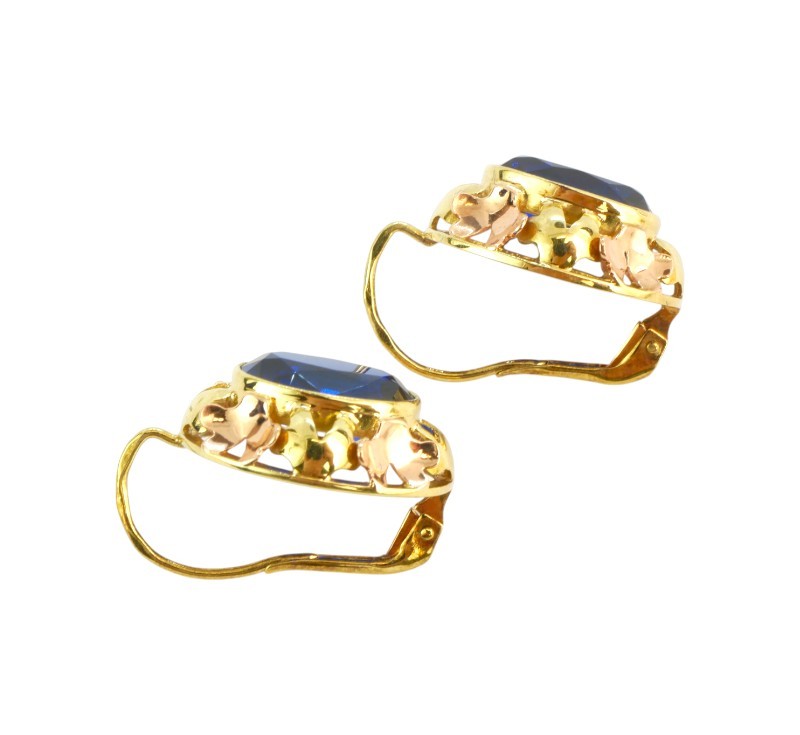 Elegantní set šperků ze zlata ryzosti 585/1000 s tmavě modrými syntetickými spinely. Prsten je zhotoven ze žlutého zlata (punc labuť), náušnice mají punc čejka. Velikost prstenu 52 hmotnost 4,14 g. Náušnice mají rozměr 2,0 x 1,5 cm a váží 6,24 g. Celková hmotnost soupravy 10,38 g.