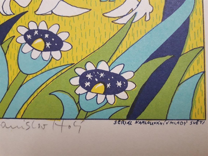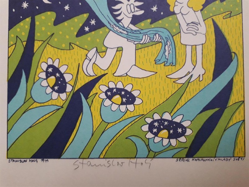 Litografie 15,5 x 22, tisková plocha 13,5 x 18,5 cm. Signováno uprostřed dole. Autor Stanislav Holý (1943-1998), m.j. autor postaviček Jů a Hele.