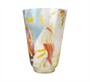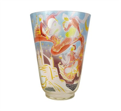 Konická váza z čirého, leptaného a malovaného skla. Motiv pohádky Tisíc a jedna noc. Výška 21,5 cm. Horní průměr 15,8 cm. Sklářské škola Nový Bor, 1946.