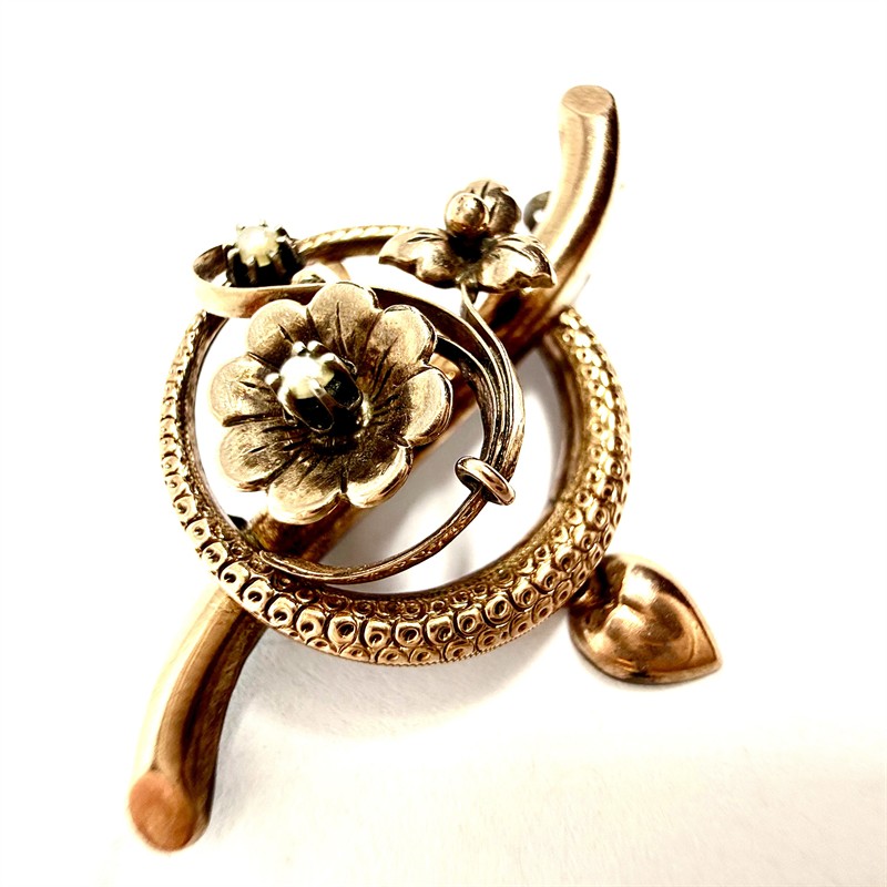 Velmi půvabná, stará brož ze silně zlaceného kovu -tzv. double. Šperk nesoucí jemný florální motiv je zdoben říčními perlami a kinetickým srdcovým ověsem a byl vyroben na konci 19.století. Rozměry cca 3,5 x 3 cm. Výborný stav.