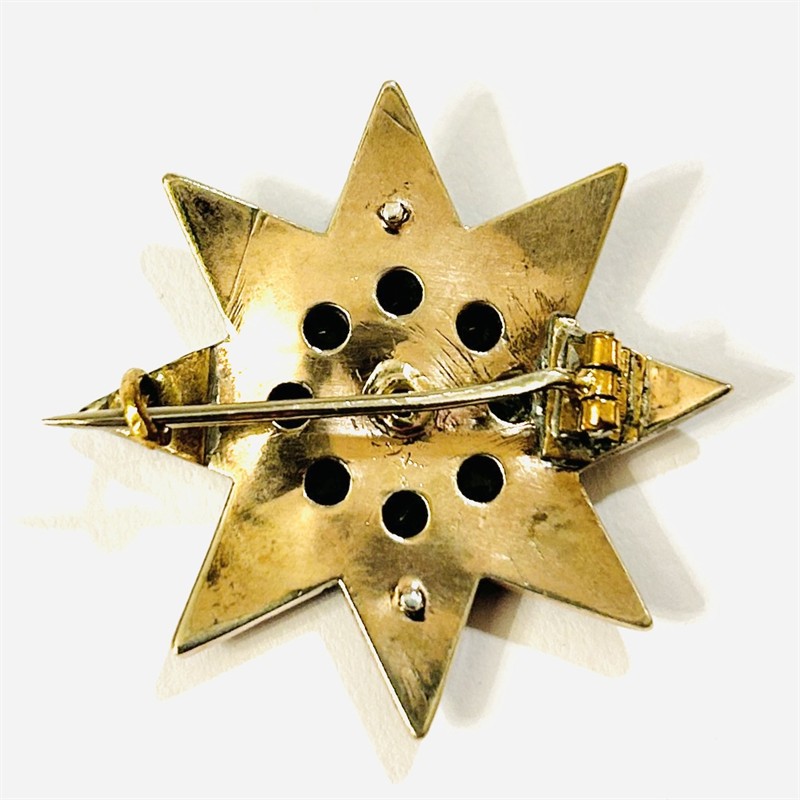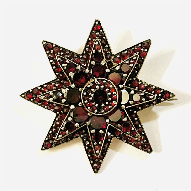 Starožitná brož ve tvaru honosné osmihroté hvězdy, v několika stupních osazeno českými granáty kulatého plochého a routového brusu, efektní kontrast větších (až 4 mm!) a drobných kamenů. Kameny mají jiskrnou barvu, fasováno nýtkovou technikou. Precizní tuzemská granátnická práce z 80. let 19. století s reflexí dobového pseudorenesančního stylu. Zasazeno ve slitině tombaku; neznačeno. Hmotnost 6,12 g, délka 34 mm. Zapínání na "C" sponu v pořádku, opravované zapínání, některé kameny doplněny jinými druhy přírodních granátů a brusů, vyčištěno a restaurováno Monikou Zemanovou, DiS., celkově v zachovalém stavu.