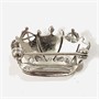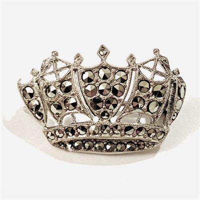 Nápaditá, blyštivá brož ve tvaru královské koruny, v pavé osázeno přírodními markazity kulatého hvězdicového brusu, bohatě prořezáváno, okraje zušlechtěny zrnkováním (milgrain). Kvalitní západoevropská šperkařská práce z 2. třetiny 20. století. Zhotoveno ze stříbřitého obecného kovu; neznačeno. Hmotnost 4,11 g, délka 27 mm, šířka 17 mm. Zapínání v pořádku, včetně pojistky, celkově v zachovalém stavu.