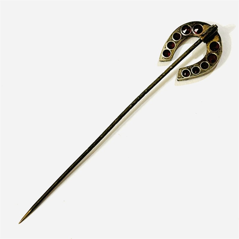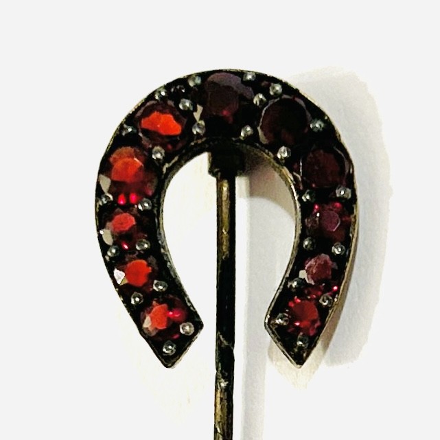 Elegantní, větší jehlice s hlavicí ve tvaru podkovy, která je tvořena stupňovitě velkými českými granáty kulatého plochého brusu, fasováno nýtkovou technikou, kameny opatřeny průsvitkami. Variabilně nositelný šperk do kravaty/šátku či klopy, s oblíbeným motivem štěstí. Tuzemská granátnická práce z konce 19. století. Zhotoveno z tombaku; neznačeno. Hmotnost 2,00 g, celková délka 13 cm, hlavice 17 mm, šířka 14,5 mm. Ponecháno s přirozenou patinou, lze vyčistit, ve velmi zachovalém stavu.