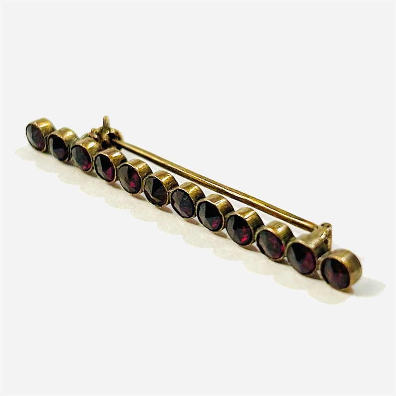 Starožitná, minimalisticky pojatá brož v podobě linie, která je v zrnitých obrubách osazena 12 českými granáty kulatého hvězdicového brusu, opatřeno průsvitkami pro lepší podsvícení kamenů. Decentní a nadčasový šperk, kvalitní, patrně německá práce z 2. třetiny 20. století. Zasazeno ve slitině tombaku. Hmotnost 2,67 g, délka 49,5 mm, šířka 4 mm. Zapínání včetně pojistky v pořádku, ponecháno s přirozenou patinou, lze vyčistit, celkově ve velmi zachovalém stavu.