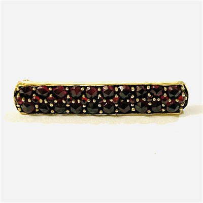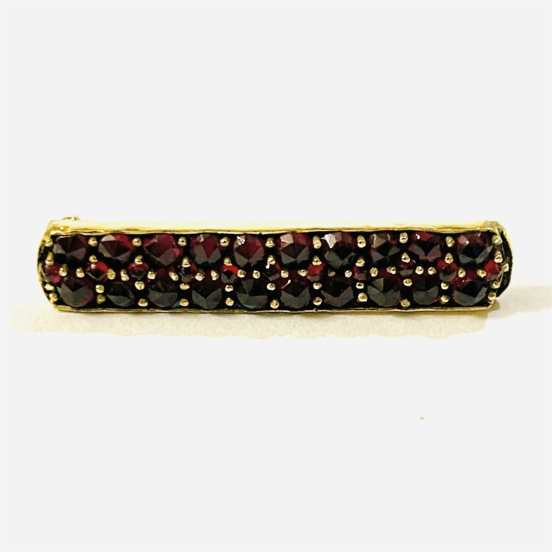 Starožitná, minimalisticky pojatá brož v podobě linie, která je ve třech řadách osazena dvěma velikostmi českých granátů kulatého routového brusu. Fasováno nýtkovou technikou. Decentní a nadčasový šperk, tuzemská granátnická práce z počátku 20. století. Zasazeno ve slitině zlaceného tombaku; neznačeno. Hmotnost 3,41 g, délka 36 mm, šířka 7 mm. Zapínání na "C" sponu v pořádku, historická konverze z jiného typu šperku, celkově v dobrém stavu, odborně vyčištěno.