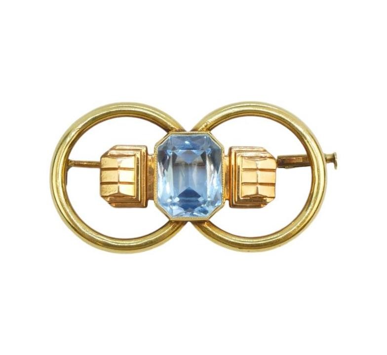 Starožitná zlatá brož Čechy, První Republika, zlato o ryzosti 14 karátů 585/1000 o celkové hmotnosti 6,94 g,syntetický spinel rozměry brože: 4 x 2,2 cm, jedná se o původní originální šperk ( nikoliv o novodobou repliku )