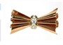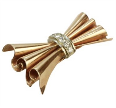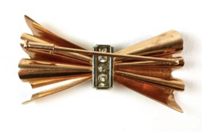 Starožitná Zlatá brož s pěti brilianty ve tvaru mašle, 30. léta 20. století. Zlato ryzosti 585/1000. 5 briliantů o celkové hmotnosti 0,30 ct, barva G, čistota VS. Celková hmotnost brože: 9,55 g. Rozměr: 4,5 x 2,4 cm. Velmi reprezentativní brož, odborně vyčištěna zlatníkem
