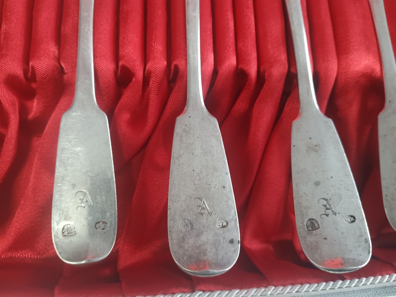 Set starožitných Rakousko - Uherských lžic vyrobeny roku 1860 ze stříbra o ryzosti 800/1000, puncováno platným třináctilotovým puncem - ryzost 812.5/1000, B pro Prahu a mistrem GD. Délka lžic je 21 cm, celková hmotnost 274,36 gramů. Zachovalý stav. Etue nepůvodní.