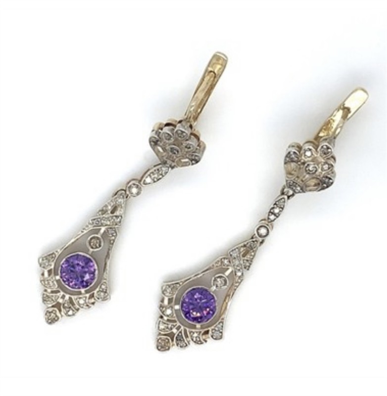 Krásné starožitné náušnice, s brilianty a Ametystem, Au 585/1000, hmotnost 7,52g, délka 40 mm, diamanty o celkové váze cca 1,20 ct,2x ametyst o celkové váze cca 0,50ct., platný punc
