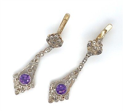 Krásné starožitné náušnice, Au 585/1000, hmotnost 7,52g, délka 40 mm, diamanty o celkové váze cca 1,20 ct,2x ametyst o celkové váze cca 0,50ct., Rusko 1930-1940, platný punc