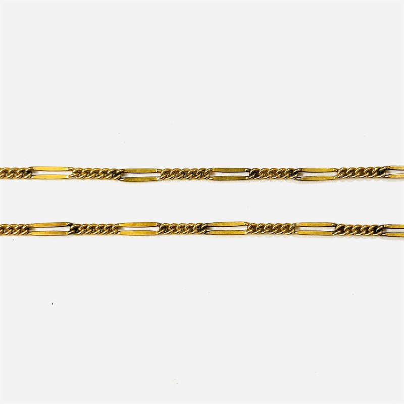 Starožitný dlouhý řetízek určený původně k dámským kapesním hodinkám (jeptiškám), lze však variabilně využít či obtočit. Decentní vazba s řetízkovinou "pancr" a podlouhlými prořezávanými články, zakončeno karabinou pro zavěšení čí připnutí. Kvalitní šperkařská práce pforzheimského výrobce Friedrich Speidel z počátku 20. století. Zhotoveno z kovu double, čili kvalitního šperkařského kovu potaženého silnou vrstvou zlata; značeno "UNION" a "SP" na puncovní destičce. Hmotnost 13,22 g, délka 86 cm, délka koncového řetízku 3,5 cm, šířka vazby 3 mm. Karabinkové zapínání v pořádku, nečištěno, celkově v zachovalém stavu.