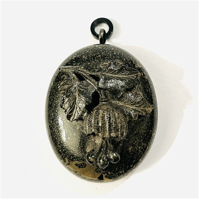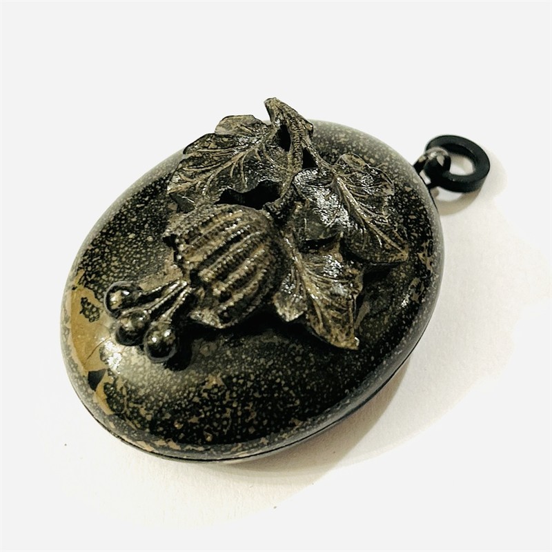 Výrazný, nevšední přívěšek sloužící jako medailon na fotografie. Oválné zaoblené tělo na přední straně s plastikou plodu s listy, vnitřní plochy schránky zdobeny ručně rytým výjevem s ptáky na stromě. Symbolikou i typickou černou barvou se jedná o smuteční šperk, který je spojený zejména s kulturou viktoriánského období. Precizní západoevropská šperkařská práce z 60. až 80. let 19. století. Sběratelsky zajímavé. Zhotoveno z ebonitu (vulcanite), tedy uměle vulkanizovanou černou pryží imitující ebenové dřevo, komponenty z černě lakovaného obecného kovu; neznačeno. Hmotnost 19,96 g, celková 57 mm, šířka 37,5 mm. Zavírání v pořádku, jeden vnitřní rámeček s krycím sklem, nečištěno, přední strana se zajímavou povrchovou oxidací laku, jinak v zachovalém stavu