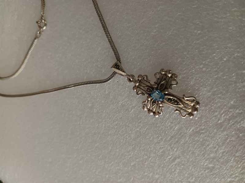 Krásný starožitný náhrdelník vyrobený ze stříbra ryzosti 925/1000 . Zdobený křížek uprostřed s modrým kamenem - spinel ? . Rozměry kříže jsou ca3,5 x 2,5 cm .Délka řetízku je 40 cm . Hmotnost 9,12 gr