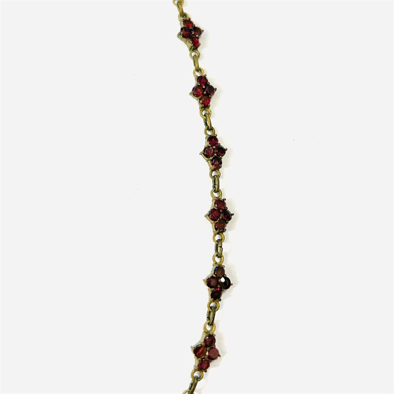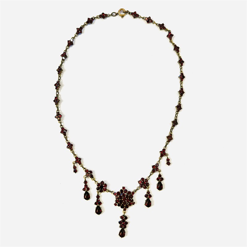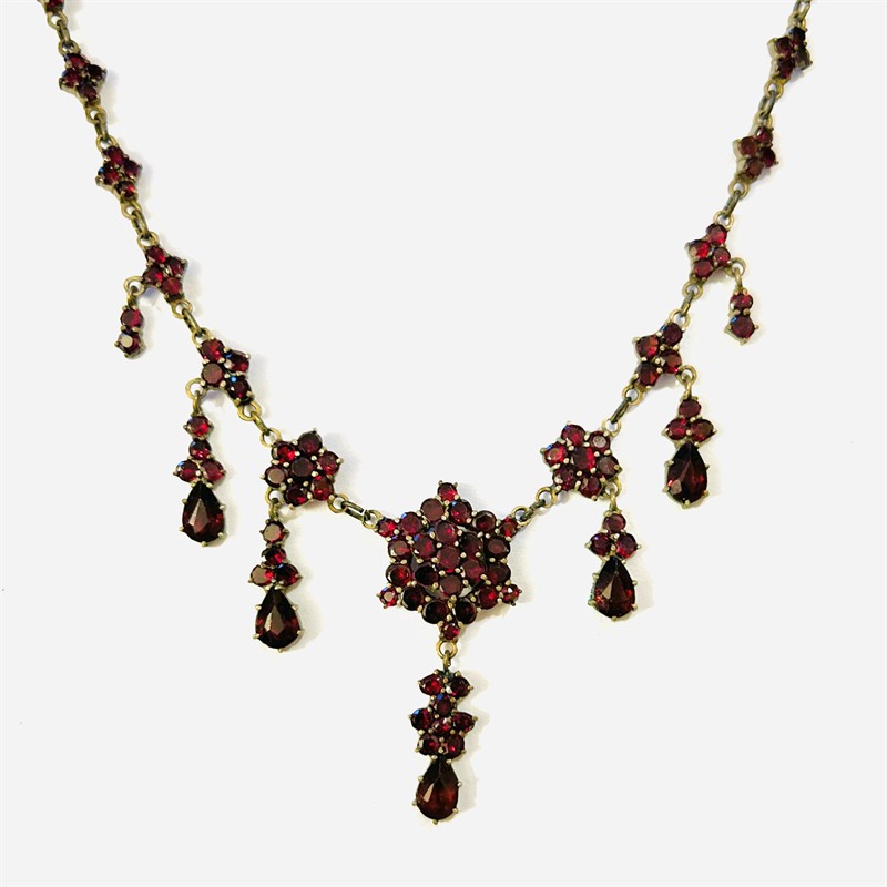 Starožitný, honosný náhrdelník skládající se z článků, z ústředními ve tvarů květů osazených českými granáty kulatého plochého brusu, některé ověsky s přírodními almandiny kapkového brusu. Fasováno v krapnových lůžkách se spodními průsvitkami, díky kterým mají kameny jasnou barvu. Tuzemská granátnická práce ze 70. až 80. let 19. století. Zasazeno ve slitině tombaku; neznačeno. Hmotnost 14,39 g, délka 44,5 cm, nejdelší ověsek 40 mm, šířka článků 6 mm. Nepůvodní zapínání formou pérového kroužku v pořádku, nečištěno, ve zachovalém stavu.