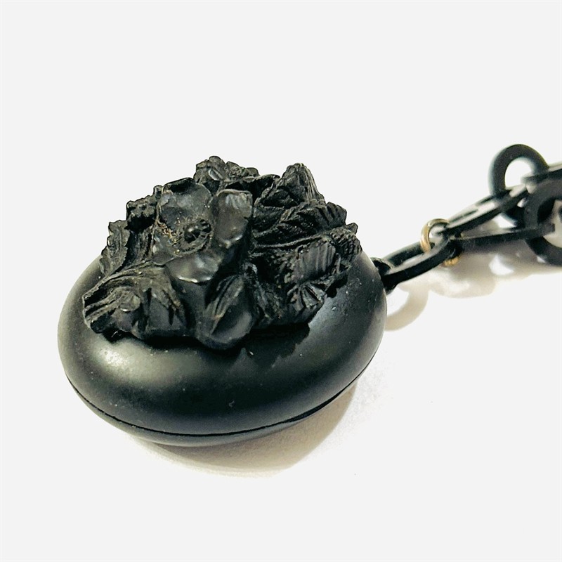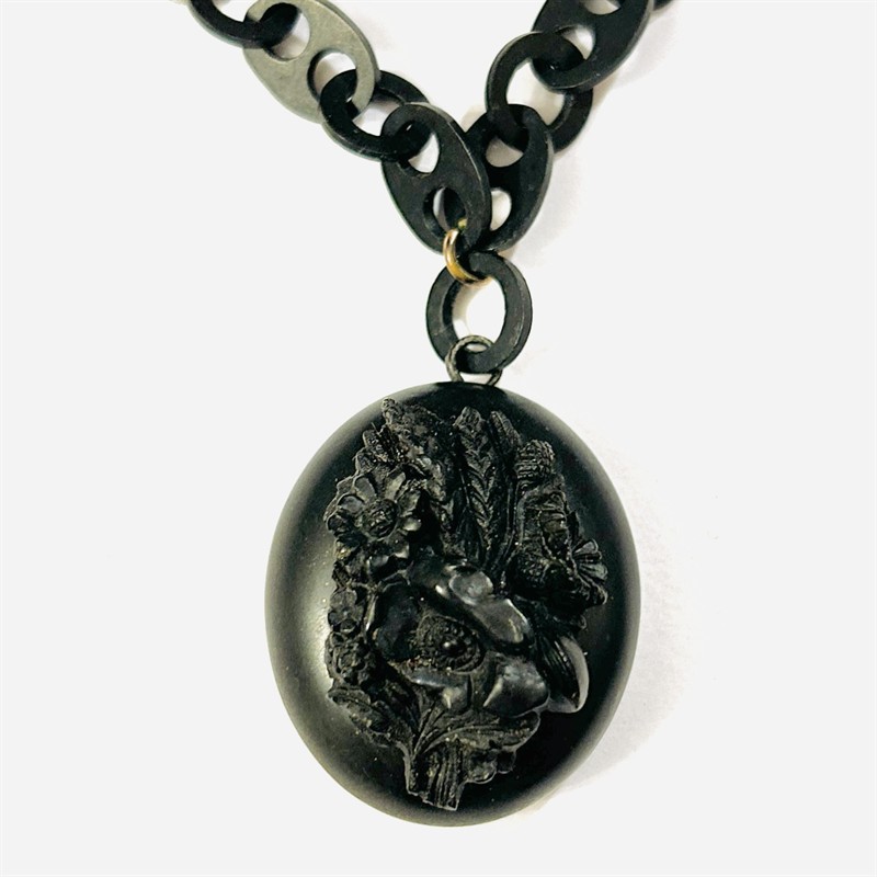 Výrazný, nevšední náhrdelník s oválným medailon na fotografie, připojen mohutnější článkový řetěz. Závěs z přední strany zdoben aplikací s bohatým květinovým motivem, vnitřní plochy schránky zdobeny ručně rytými ornamenty s ústředním výjevem ještěrky, jež je znamením regenerace a ochráncem při překonávání životních překážek. Symbolikou i typickou černou barvou se jedná o smuteční šperk, který je spojený zejména s kulturou viktoriánského období. Precizní západoevropská šperkařská práce z 60. až 80. let 19. století. Sběratelsky zajímavé. Zhotoveno z ebonitu (vulcanite), tedy uměle vulkanizovanou černou pryží imitující ebenové dřevo, komponenty ze stříbřitého obecného kovu; neznačeno. Hmotnost 21,48 g, délka řetězu 62 mm, šířka 11 mm, délka medailonu 36 mm, šířka 30 mm. Zapínání formou pérového kroužku v pořádku, nečištěno, jinak ve velmi zachovalém stavu.