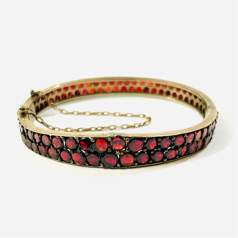 Starožitný, efektní otevírací náramek s rozšiřující se horní polovinou, po celém obvodu osazeno ve dvou řadách přírodními českými granáty kulatého plochého brusu, fasováno nýtkovou technikou, kameny opatřeny průsvitakmi pro jejich lepší podsvícení. Precizní tuzemská granátnická práce z poslední pětiny 19. století. Zasazeno ve slitině tombaku, patrně s nízkoryzostní příměsí zlata, neznačeno. Hmotnost 13,34 g, vnější délka 62 mm, vnitřní 55 mm, šířka 6-9 mm. Jazýčkové zapínání včetně pojistného řetízku v pořádku. V minulosti opravováno, nově restaurováno, celkově v dobrém stavu.