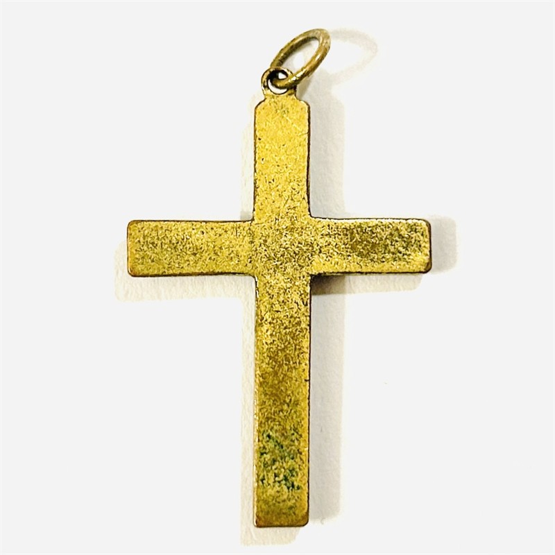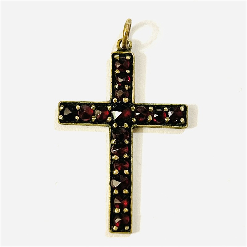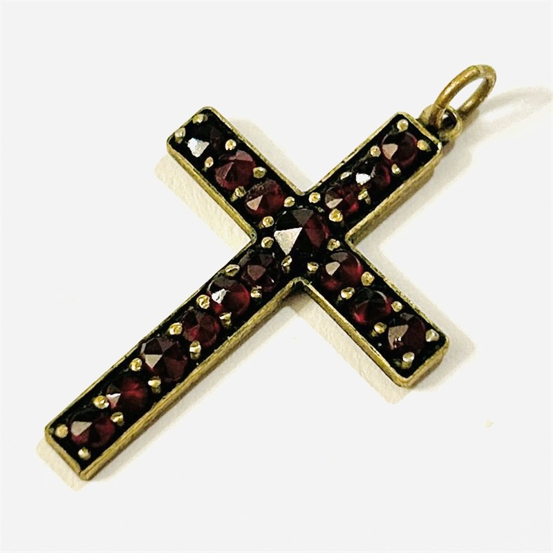 Elegantní přívěšek ve tvaru latinského kříže, osazeno českými granáty kulatého routového brusu fasováných nýtkovou technikou. Tuzemská granátnická práce z poslední pětiny 19. až počátku 20. století. Zasazeno ve slitině zlaceného tombaku; neznačeno. Hmotnost 1,80 g, celková délka 34 mm, šířka 20,5 mm. Zlacení částečně setřeno, celkově v zachovalém stavu.
